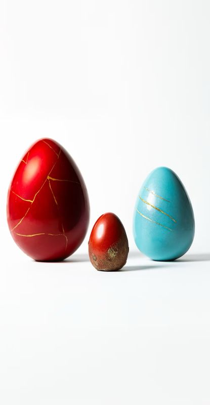 Chaque œuf est peint à la main, dans des couleurs vives et affirmées, pour célébrer ces renaissances de femmes.